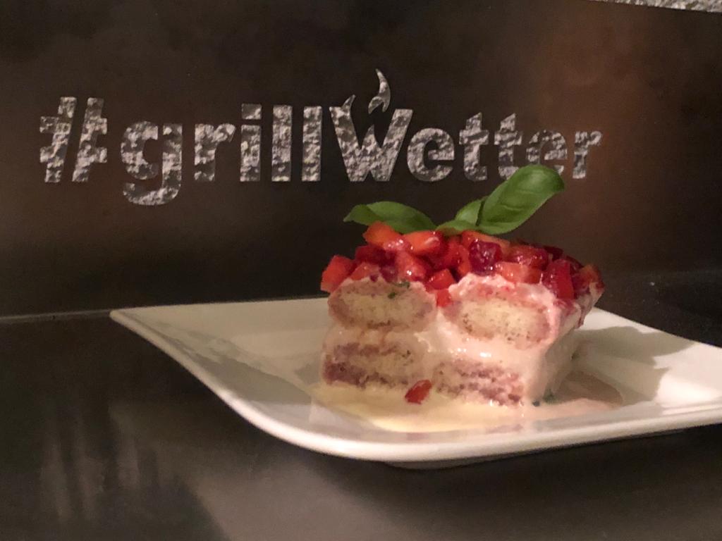 - Die restlichen Erdbeeren in ca. 3mm Würfel schneiden und gleichmäßig auf dem Tiramisu verteilen.