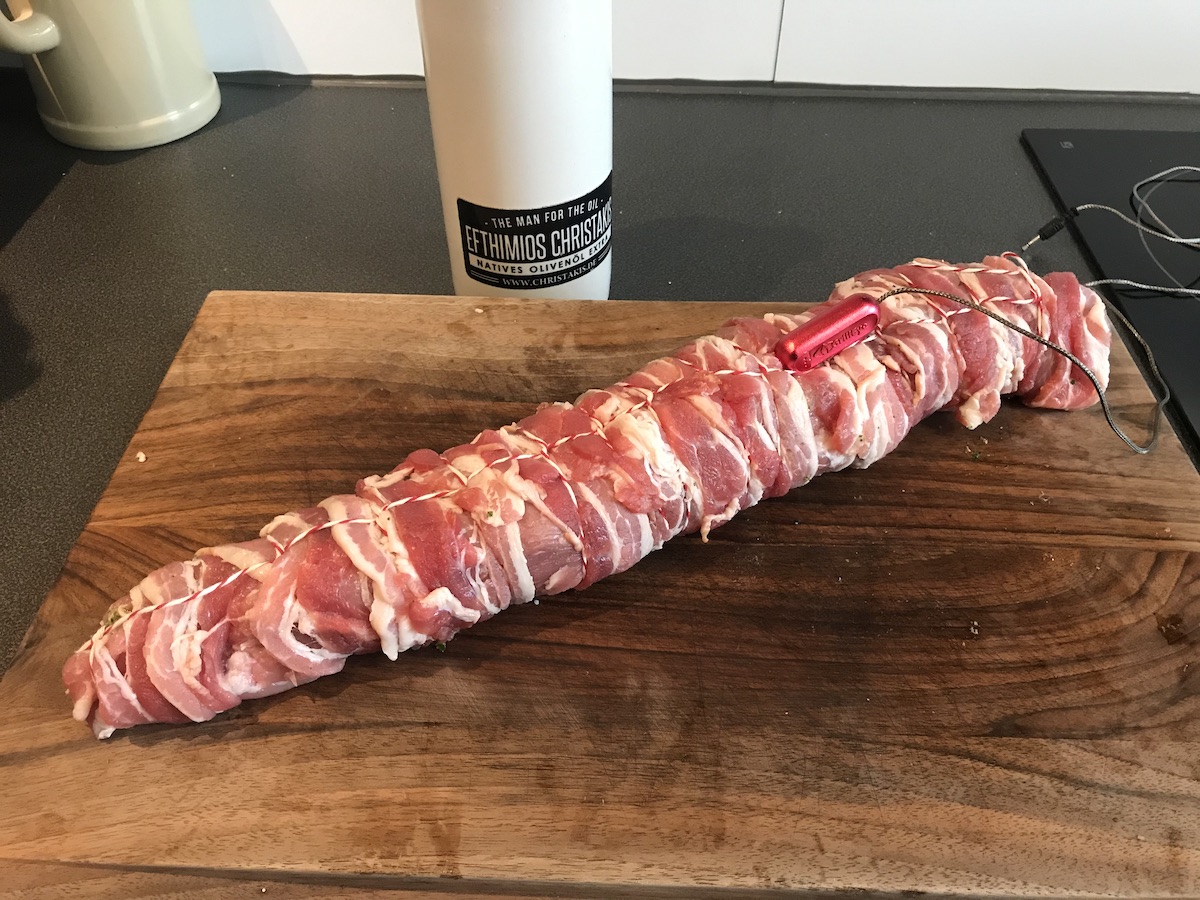 gerollte Schweinelende mit Bacon umwickeln und mit Küchengarn binden
